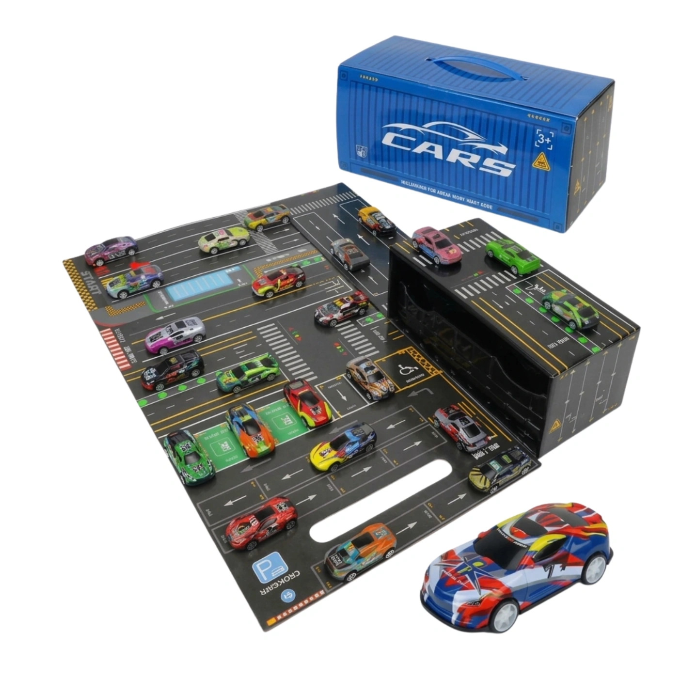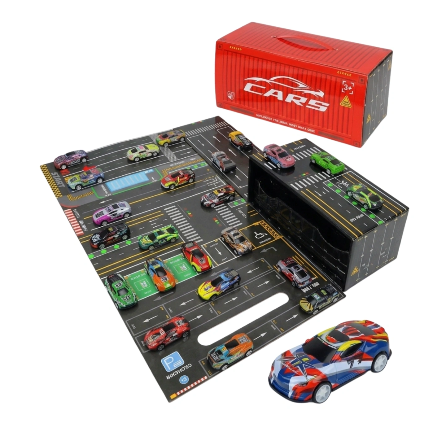 The container isn't just for storage; it's a portable garage featuring a built-in handle for racing on the go. Whether they are organizing their collection in the internal compartments or creating a mini-city adventure with the integrated road map, this set provides hours of screen-free, interactive fun.