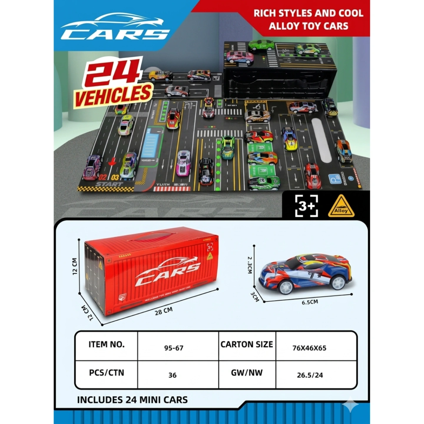 Individual Car Size: 6.5 cm x 3 cm x 2.3 cm