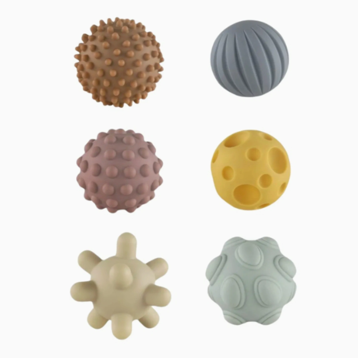 Sensory Development: The set includes six balls with unique textures (such as ridges, bumps, or spikes) to promote tactile nerve development and hand-eye coordination.