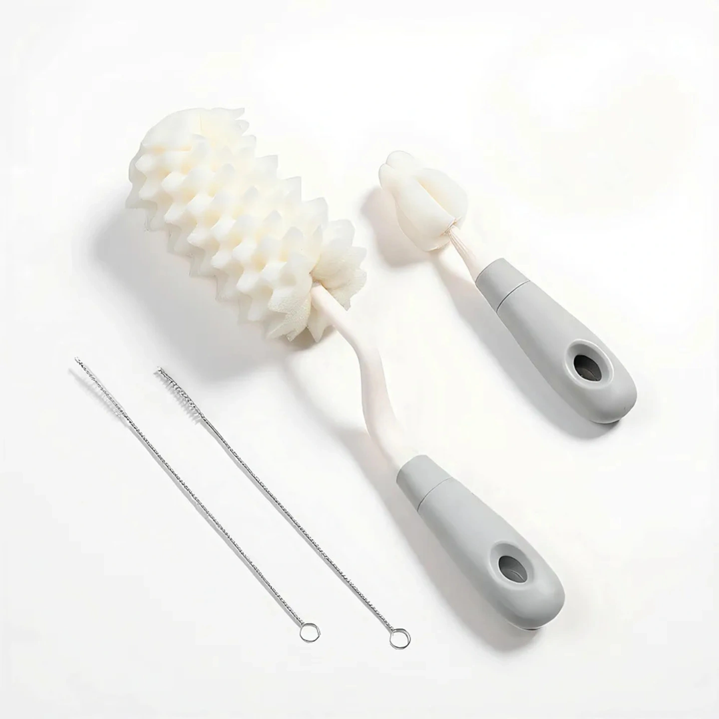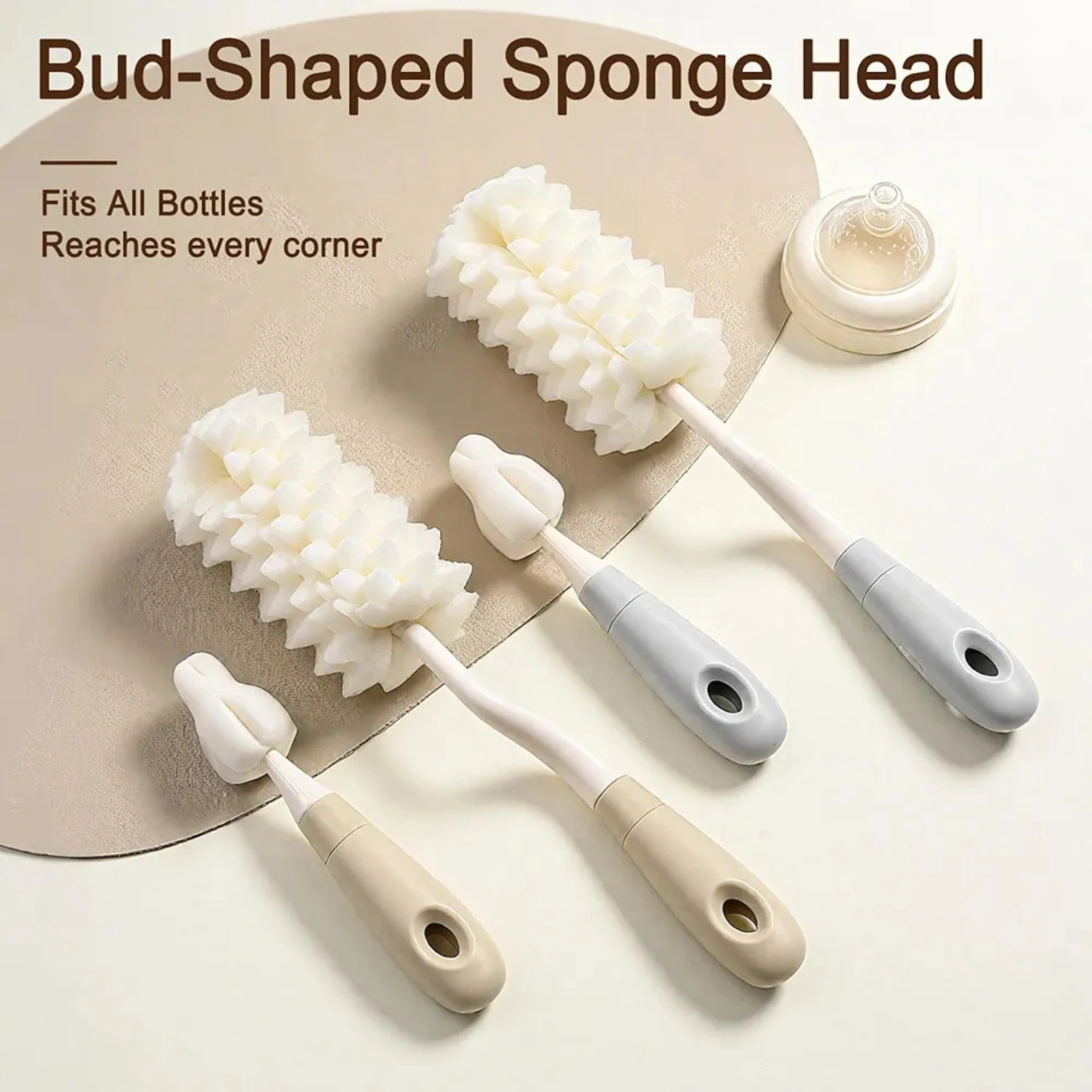 4-in-1 Baby Bottle Cleaning Brush Set - 360° Rotating Wave Sponge Bottle Brush, Nipple Cleaner, and Dual Straw Brushes (Gray/Beige)